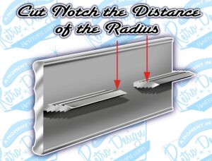 When applying the metal to an outside corner you will need to radius the corner. Most T edging is flexible down to a 3-inch radius. You will need to notch the T out for the entire length of the radius so that the metal will bend evenly around the corner. The T can be cut out with a wheel-type hand grinder or jigsaw with a fine metal blade.