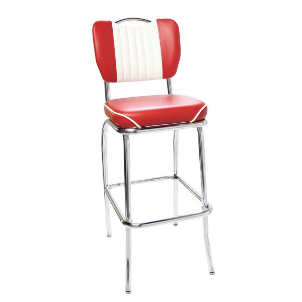 Handle back Malibu retro stools - 921 HBMBW-BS with red cracked ice upholstery and white piping and channeling.