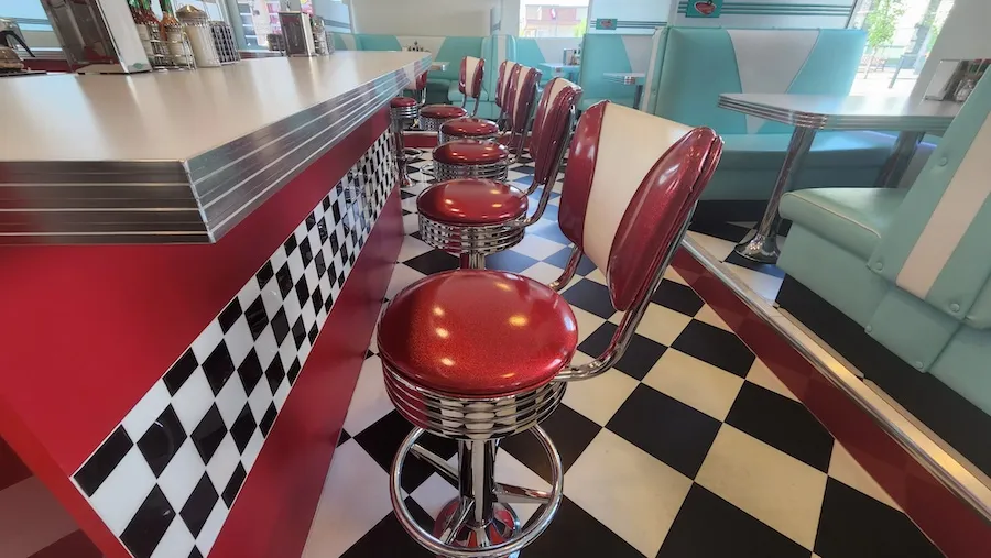 Retro booths with high backs and bold patterns are a staple for diners. Opt for a mix of pastels and bold hues to keep things lively. Retro car booths and sofas are a must-have!